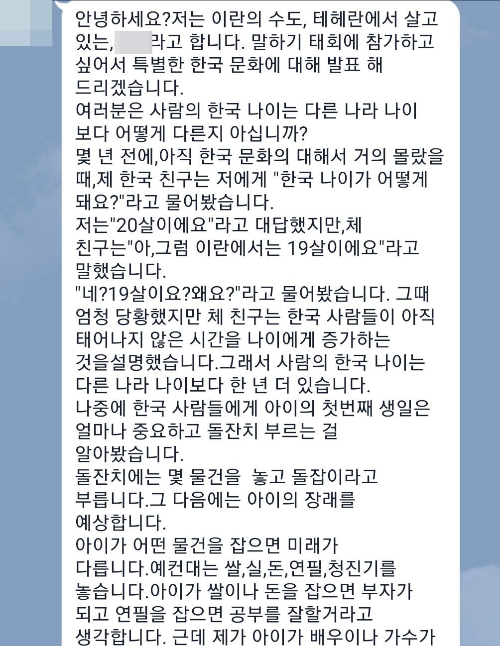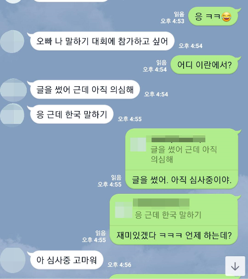 다시 이란 동생이야기로 넘어가서, 그녀는 나에게 말한다. '오빠 나 말하기 대회에 참가하고 싶어. 참가 신청을 했어 심사 중이야. 오빠 도움이 필요해' 정도의 내용이다.