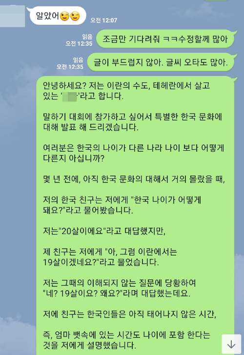 나는 운동 끝나고 이것저것 할 일이 많고 바빴던 시간이라 '오늘은 조금 할 일이 바쁘니 내일 너의 글을 수정해서 보내줄게라고 하였다. 그리고 내가 너의 발표 글을 읽는 음성 메시지도.. 참고하라고 보내줄게' 그렇게 시간이 흐르고 저녁 늦게 블로그를 작성하고 있을쯤 다시 메시지가 왔는데 4일밖에 발표 기간이 남지 않아 급한가 보다, 결국 나는 내 블로그 작성을 잠시 미루고 그녀의 발표 글을 대대적으로 수정해주고 주석까지 달아서 그녀에게 보낸다.