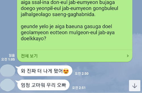 오타쟁이 동생.. 글이 더 나아졌다고 고마워한다. 아무튼 그렇게 발표글을 만들어 보내주고 오늘은 급한 거 같아서 아침 일찍 동생에게 그 글을 문장마다 또박또박 읽어서 메시지를 보냈다.