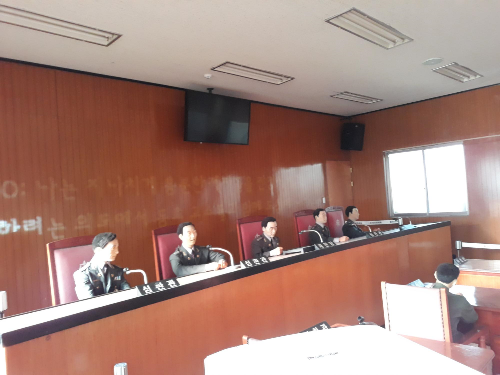 제가 갔을때 법정에는 스크린이 설치되 있었습니다. 상무대 당시 재판 영상을 보여주기 위해서 입니다.(당시 재판 판결문과 피고인의 최후진술) 스크린 뒤를 보니 재판관들이 보였습니다.
