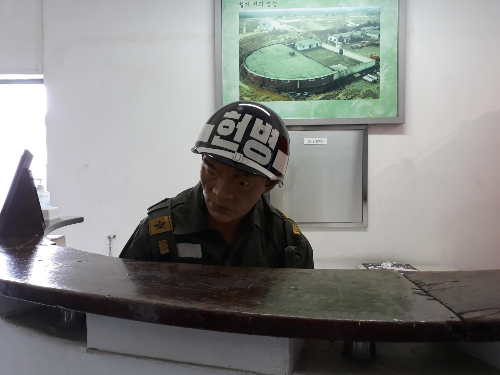 매서운 감시 헌병, 전에 왔을땐 두명이었는데 한명이 팔이 부러져 있어 치운거 같습니다. 1소대부터 7소대까지 6개의 방이 부채꼴로 되어 있어 감시 헌병이 투옥된 인사들의 행동을 일거수 일투족 감시할 수 있도록 건물이 디자인되 있습니다. 수감자가 조금이라도 움직이면 몽둥이로 매질하는 등의 만행을 저질렀다고 하네요.