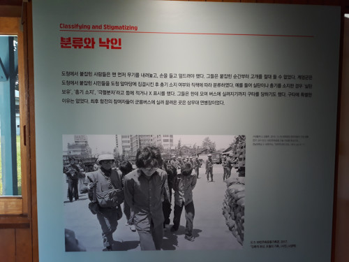 몽둥이로 맞지 않을려면 하루종일 정좌하여 부동자세로 계속 있어야했습니다. 22평 남짓한 수용 거실에 많게는 100여명에서 200여명까지 거주했습니다. 붙잡힌 시민들은 민간인 신분이었지만, 범죄를 저지른 군인과 동일한 처우를 받게 했습니다. 구금자들은 또한 별다른 이유 없이 헌병들에게 모진 구타를 당하기도 했습니다. 심지어 구금자들에게 간단한 의약품가지 지급되었는데, 멍 자국이나 구타 흔적을 지우기 위해서였다고 합니다. 그 이유는 재판에 참석한 가족득을 비롯한 방청객들이 구금자들의 몸 상태를 눈으로 확인할 수 있었기 때문입니다. 그렇게 영창을 빠져나옵니다.