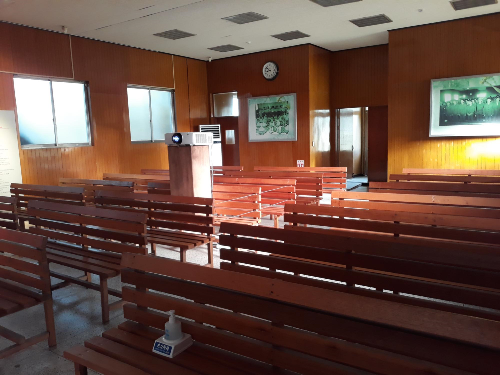 입구가 법정 같진 않지만 문을 열어 상무대의 군사 재판이 있는 법정으로 들어가 봅니다.