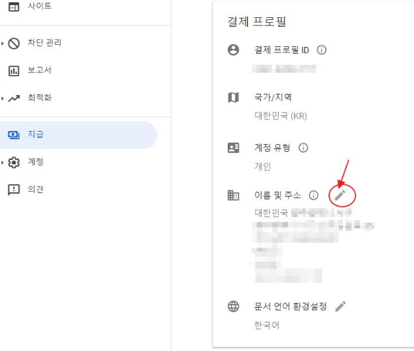 자신이 설정한 실제 주소를 왼쪽 지급 메뉴로 들어가서 오른쪽 메뉴의 설정, 그밑에 설정 관리로 들어가면 결제 프로필 란에서 연필 아이콘을 누르면 수정가능합니다.