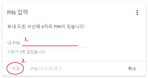 바로 이곳에 구글이 보낸 6자리 숫자의 PIN번호를 적고 제출을 눌러주면 인증이 끝이 나게됩니다. 만약 구글이 보낸 편지를 받지 못했다면 이창에서 PIN 다시 보내기 버튼으로 재요청할수 있는데요.