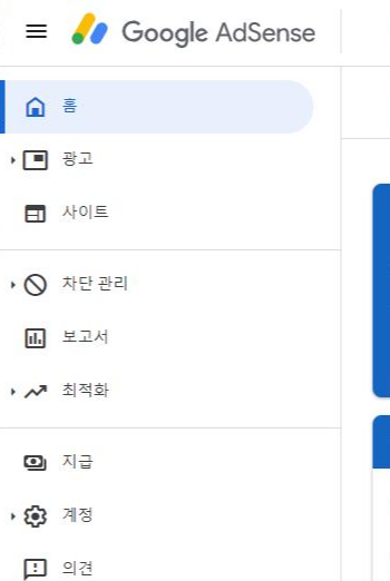 저 메시지가 보인다면 우선 먼저 구글애드센스에 로그인을 하고 왼쪽의 홈 메뉴를 누릅니다.