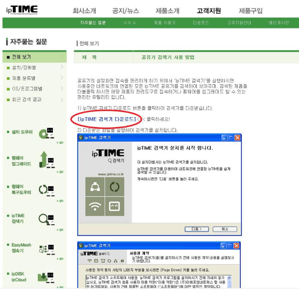 사이트를 들어가 [ipTIME 검색기 다운로드]를 클릭하여 파일을 다운로드하고 PC에 설치를 합니다.