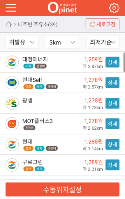 좌측 밑에는 시도별 최저가 주유소를 3분마다 갱신해주기도 하는데요.