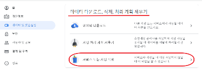 오른쪽에 스크롤을 밑으로 쭈욱 내려보면 데이터 다운로드, 삭제, 처리 계획 세우기 옵션이 보입니다.