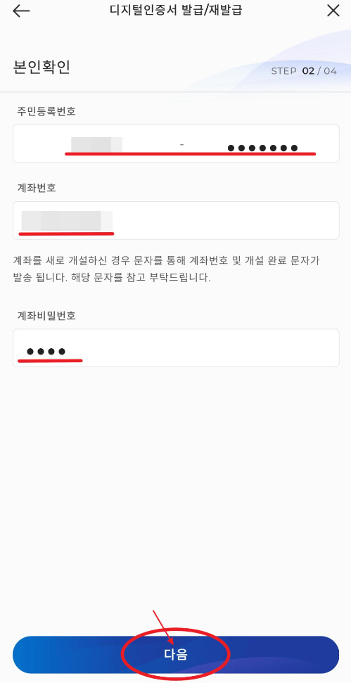 다시 본인 확인 절차에 들어갑니다. 주민등록번호와, 앞서 만든 두드림 통장의 계좌번호, 계좌비밀번호를 적고 다음을 눌러줍니다.