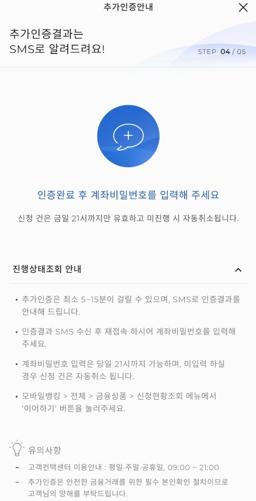16. 이제 은행에서 최종 검토를 하는거 같습니다. 잠시 기다려야하는데요. 5~15분후에 인증이 완료되어 SMS로 인증결과가 오게됩니다.