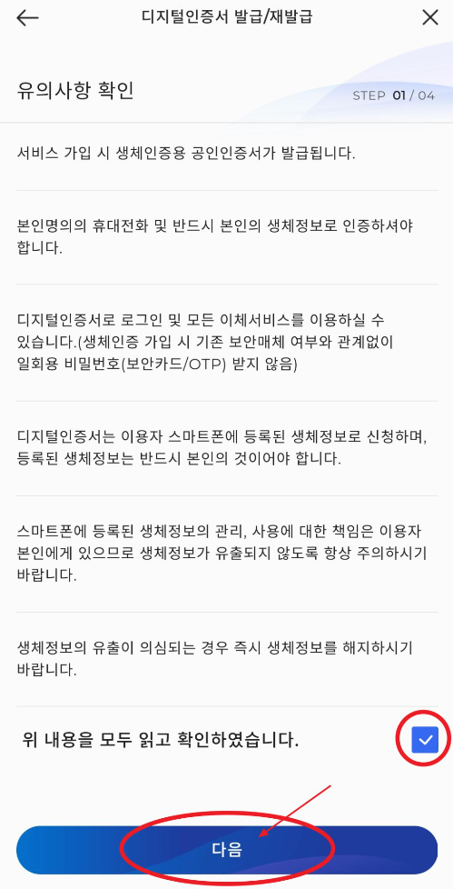 유의 사항을 읽어보고 위 내용을 모두 읽고 확인하였습니다를 V체크 후 다음을 눌러줍니다.