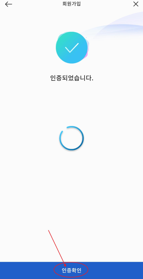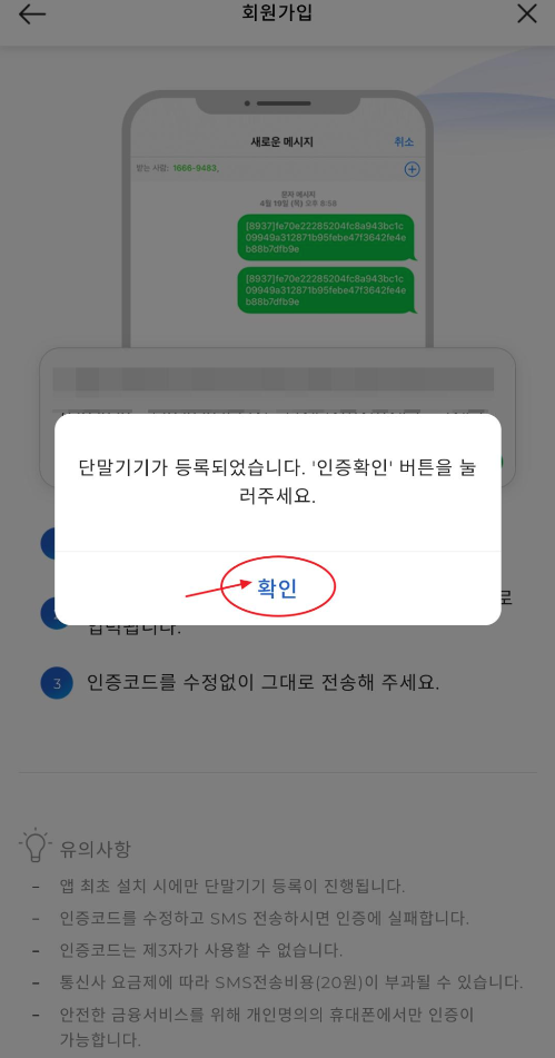 10. 단말기기가 등록되었습니다. 확인을 눌러주세요. 그리고 인증되었습니다. 화면에서 인증확인을 눌러주세요.