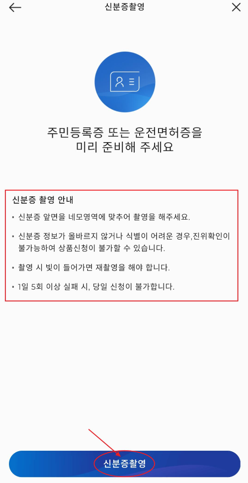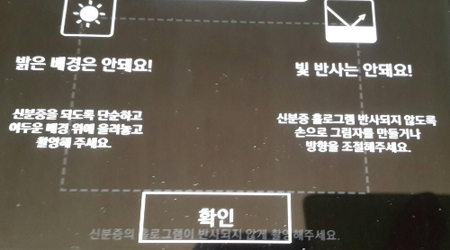 준비한 주민등록증 또는 운전면허증의 앞면을 촬영시 네모영역 칸안에 맞춰 촬영해야하는데요. 선명해야하며 빛 반사로 홀로그램이 빛나는 일이 없어야합니다. 하루 5회 이상 실패시 당일 신청이 불가하기 때문에 신중해야하며 잘 나왔다 싶을때 촬영버튼을 꾹 눌러 주세요.