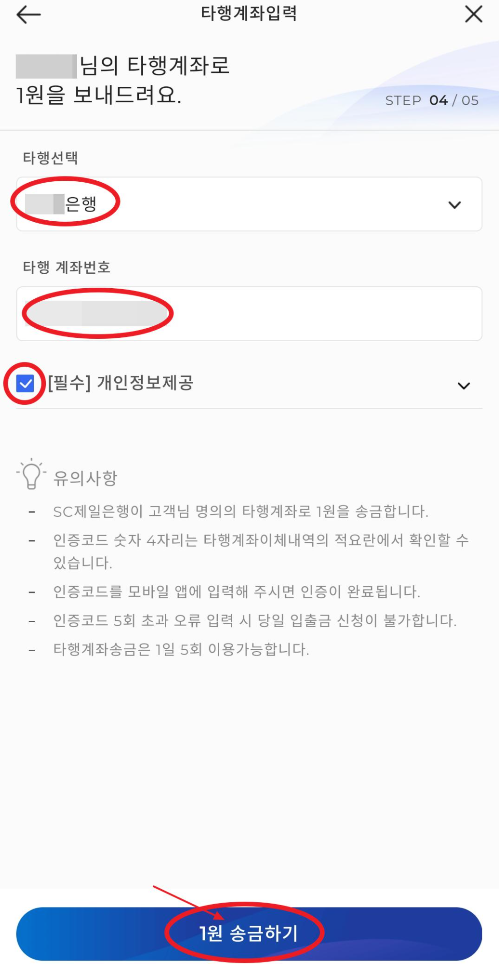15. 다른 인증이 하나 더 기다리고 있습니다. 타행 계좌입력인데요. 자신이름으로 소유하고 있는 다른 은행 계좌번호는 - 없이 입력하고 [필수] 개인정보제공을 V체크한 후 1원 송금하기를 눌러줍니다.