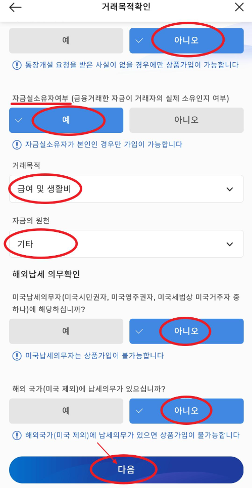14. 다음은 거래목적확인을 합니다. 자금실소유자여부는 꼭 예를 체크해야하며 저는 거래목적은 급여 및 생활비, 자금의 원천 은 기타로 해놓았습니다. 그리고 해외납세 의무확인의 미국납세의무자 질문은 당연히 모두 아니오로 체크했습니다. 그리고 다음을 눌러 다음 절차로 들어갑니다.