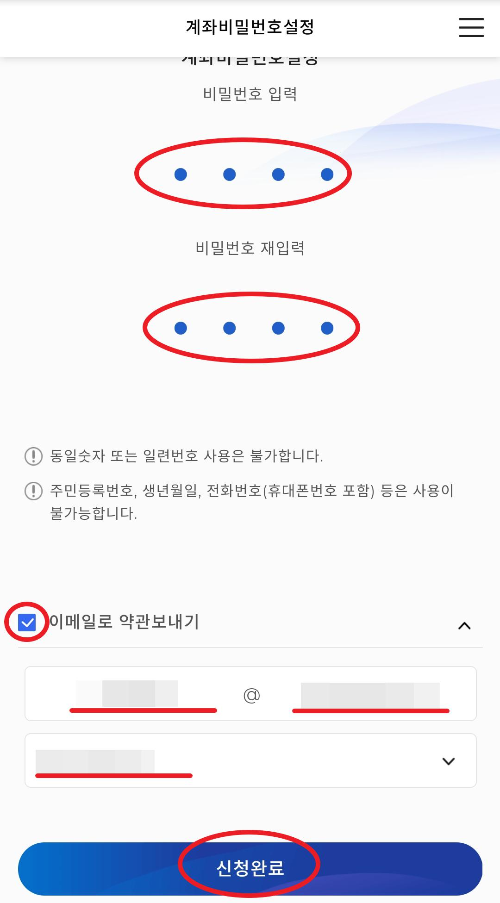자신이 원하는 통장 비밀번호 4자리를 입력합니다. 이메일로 약관보내기를 V체크하고 자신의 이메일주소를 적어주세요. 그리고 신청완료를 클릭해줍니다. 이렇게 원화 입,출금 두드림 통장은 만들어졌습니다.