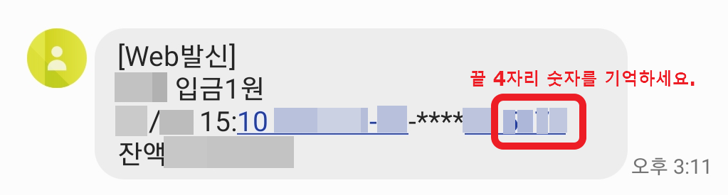다른 은행 계좌에 입,출금 알람을 설정해 놓으셨다면 바로 문자메시지로 1원 송금내역을 확인할수 있는데요.