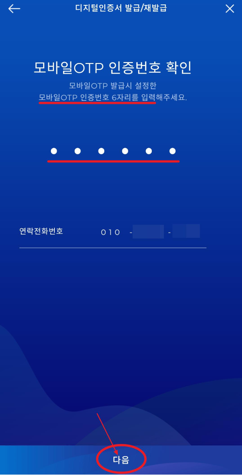 앞서 가입한 모바일OTP 인증번호를 확인해야합니다. 설정한 인증번호 6자리를 입력하고 다음을 눌러줍니다.