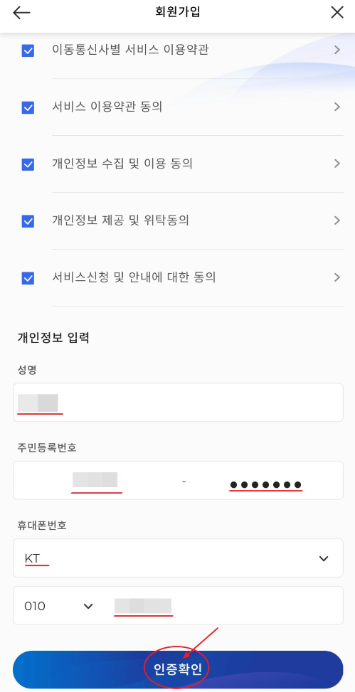 다음에도 약관들을 모두 체크하고 성명, 주민등록번호, 휴대폰번호 등의 개인정보를 입력해줍니다. 그리고 인증확인을 클릭합니다.