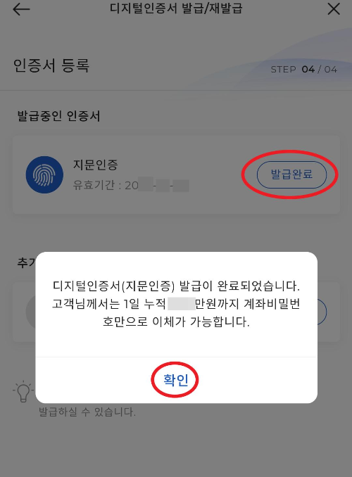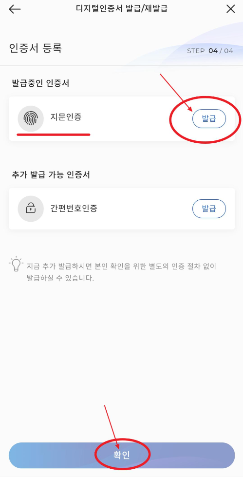 인증서 등록 중에 지문인증을 선택하고 발급을 눌러주고 확인을 눌러주세요. 그러면 잠시 핸드폰(지문인식가능한 핸드폰만)에 자신의 지문을 터치해야합니다. 그리고 자신의 지문이 인증이 되고 아주 쉽게 다음단계로 넘어갑니다.