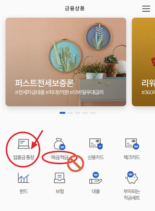 1. 먼저 모바일 뱅킹 앱 메뉴를 보면 입출금 통장 메뉴와, 예금/적금 메뉴가 보입니다.