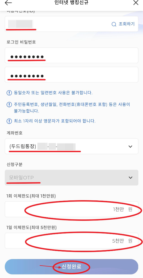 인증이 끝나면 이용자번호(ID), 로그인 비밀번호 8자리, 앞서 만든 두드림통장 계좌 연결, 1회 이체한도와 1일 이체한도를 설정하고 신청완료를 해주면 마무리가 됩니다.