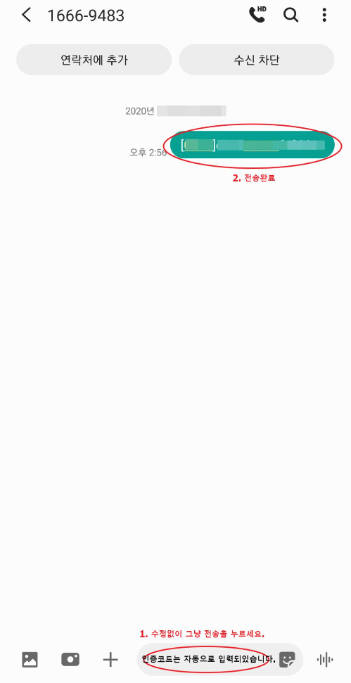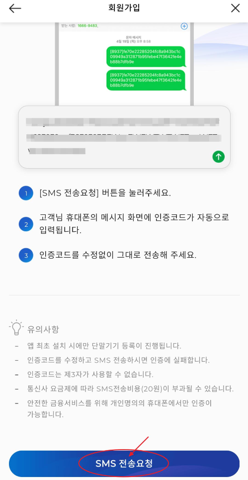 9. 앱 최초 설치시 단말기기 등록을 해야합니다. SMS 전송요청을 눌러주세요. 그러면 휴대폰 문자 메시지 화면에 인증코드가 자동으로 입력됩니다. 수정하지말고 바로 전송하세요.