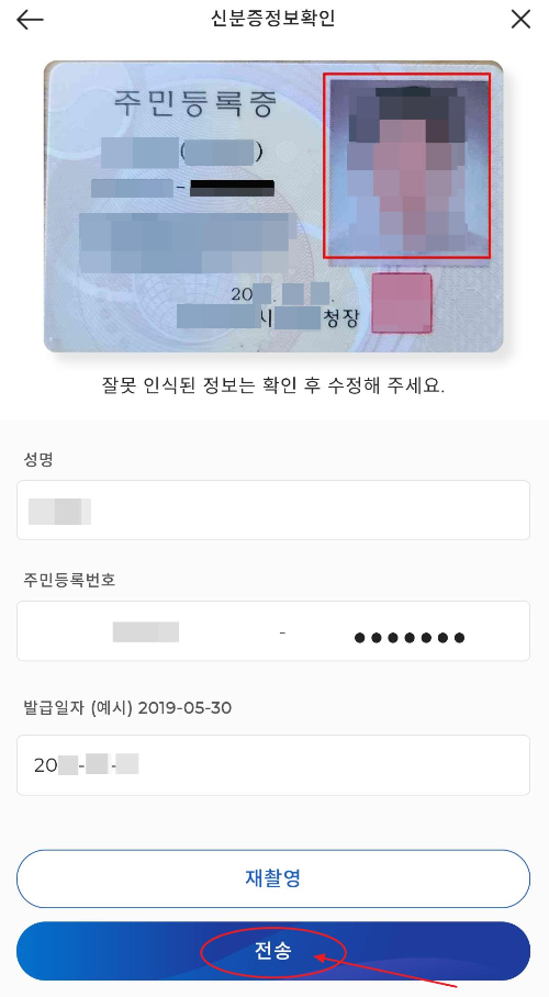 촬영이 완료되면 촬영된 신분증을 미리보기가 되는데요. 신분증 촬영으로 자동 인식된 성명, 주민등록번호, 발급일자가 정확한지 확인하고 이상이 있다면 재촬영, 이상이 없다면 전송을 눌러 마무리합니다.