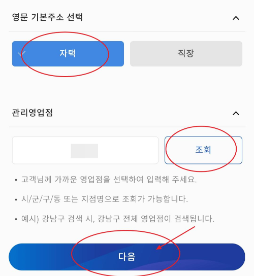 영문 기본주소 선택에서 자택을 선택하고 관리영업점은 자신이 외화통장을 만들어 거래를 할 지점을 조회하는 것입니다. 조회를 눌러 자신의 집과 최대한 가까운곳을 선택하세요. 그리고 다음을 눌러줍니다.