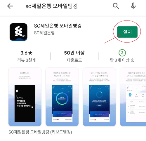 1. 구글 플레이 스토어에서 'SC제일은행 모바일뱅킹'을 검색합니다. 그리고 설치를 눌러주세요.
