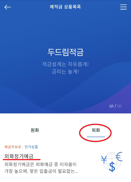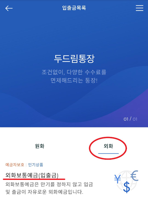 예금/적금 메뉴로 들어가서 보이는 외화 통장은 외화정기예금 통장으로 예금개념의 외화통장입니다. 우리가 만들려던 통장이 아닙니다. 헤깔릴수 있으니 잘확인하시기 바랍니다.