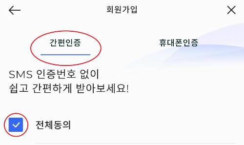 8. 여기서 부터 집중해야합니다. 인증 방법을 선택합니다. 간편인증과 휴대폰인증이 있지만 저는 간편인증을 선택하였습니다. 그리고 전체동의 V체크하고 자신의 성명, 주민등록번호, 휴대폰번호를 적어주고 인증확인을 클릭합니다.