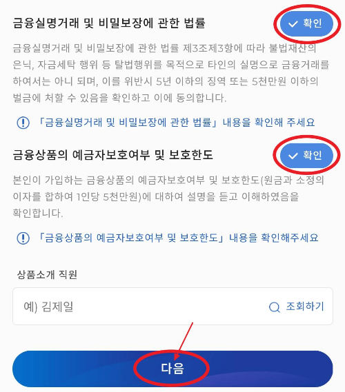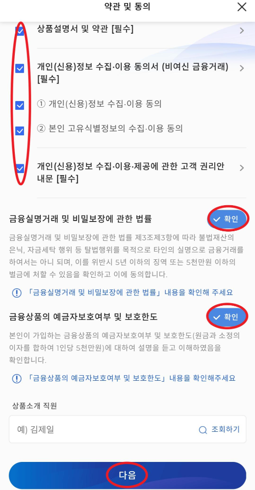 13. 촬영에 성공했다면 약관 및 동의 절차에 들어가는데 전체동의를 V체크해주시고 금융실명거래 및 비밀보장에 관한 법률, 금융상품의 예금자보호여부 및 보호한도 등도 잘 읽어보시고 V확인을 눌러주세요. 그리고 다음을 눌러 그다음 절차에 들어갑니다.