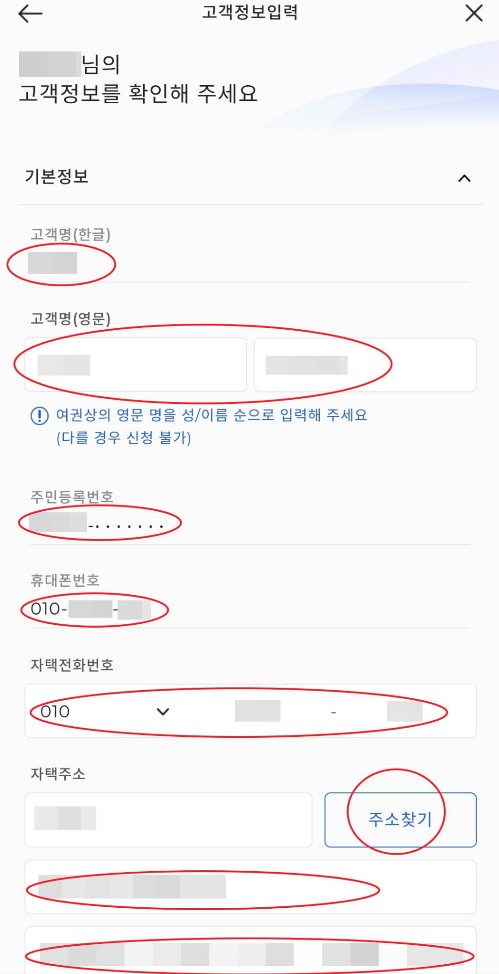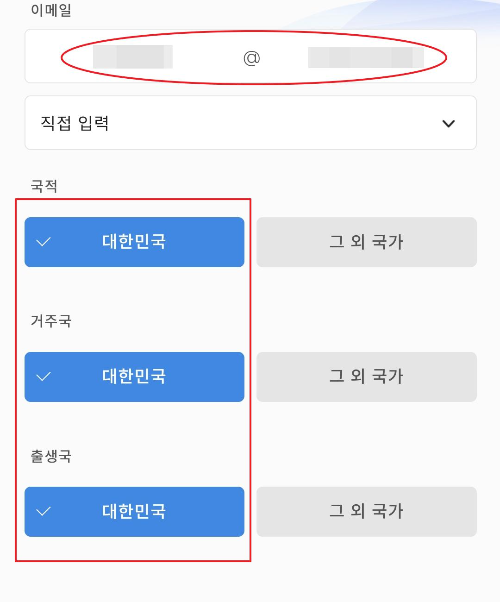 그리고 주민등록번호, 휴대폰번호, 자택전화번호, 자택주소는 주소찾기로 찾아 기입해주시고, 이메일 주소와 국적을 입력하세요. 대부분 대한민국일꺼라 믿습니다.