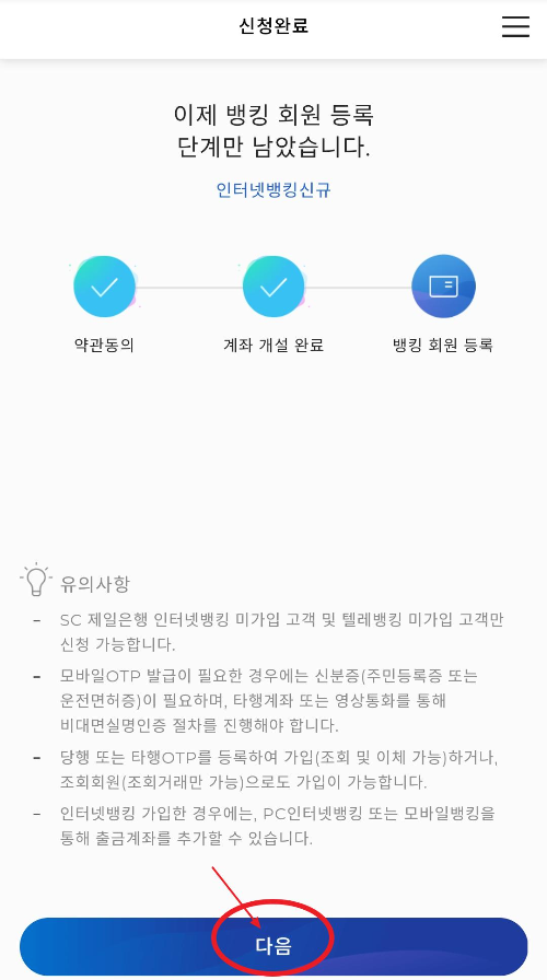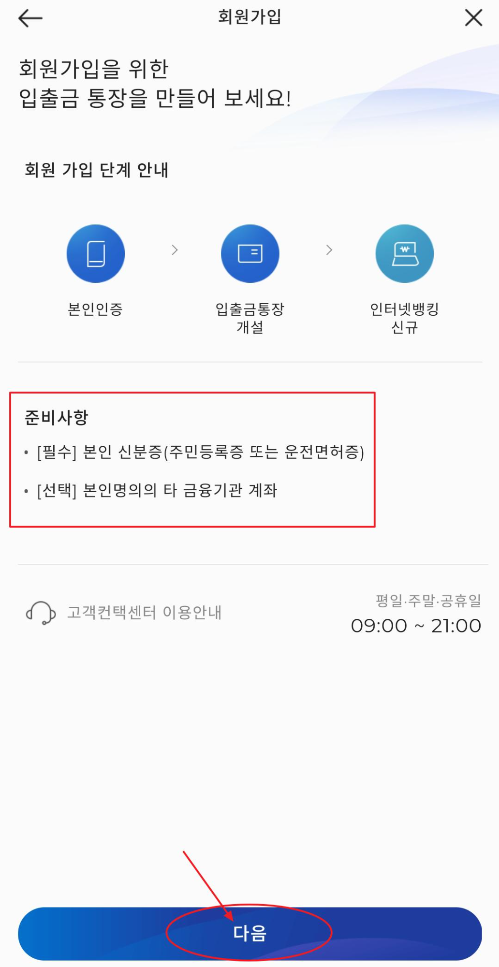 6. 회원가입을 위한 입출금 통장을 만들어 볼텐데요. 회원 가입 단계 안내와 준비사항을 읽어보고 다음을 눌러 줍니다.