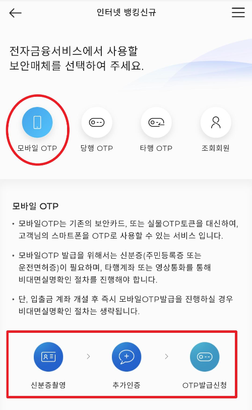 뱅킹 회원 등록단계는 인터넷 뱅킹과 텔레뱅킹 미가입 고객만 신청할수 있습니다. 인터넷 뱅킹을 이용하기 위한 모바일 OTP 신규가입은 앞서 설명한 신분증 촬영 인증방법과 SMS인증, 타행 계좌 인증을 이용합니다. 앞에서 잘보았다면 만드는 건 어렵지 않을 것입니다.
