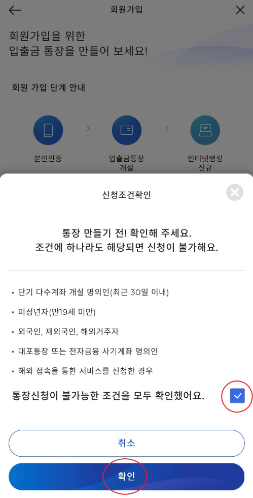 7. 신청조건과 신청불가 조건을 확인합니다. 통장신청이 불가능한 조건을 모두 확인했어요.란에 V체크 하고 확인을 눌러줍니다.