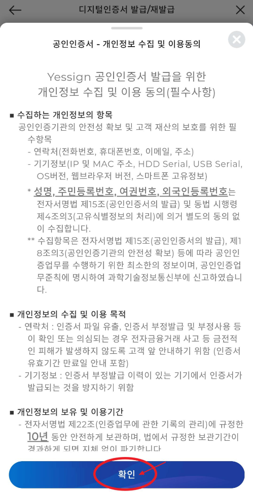 공인인증서 - 개인정보 수집 및 이용동의를 읽어 보시고 확인을 누릅니다. 그리고 다음 절차인 약관동의에서는 전체동의를 체크하고 다음을 눌러줍니다.