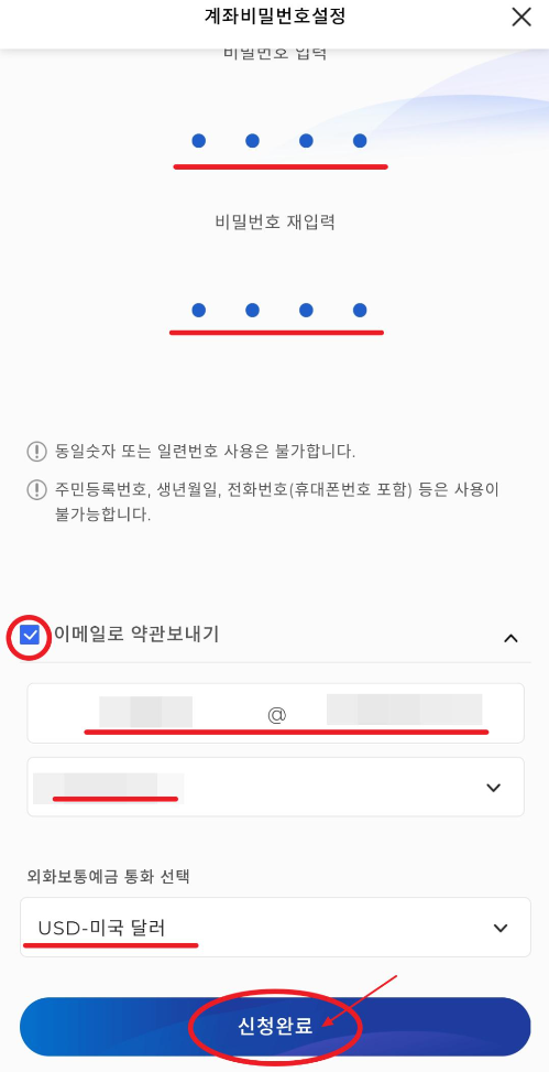 자신이 하고 싶은 비밀번호로 4자리수를 입력하고 이메일로 약관보내기 체크, 이 메일주소, 외화보통예금 통화 선택을 구글애드센스 용이기 때문에 USD-미국 달러로 선택하고 신청완료를 누르면 간단한 통장개설이 완료됩니다.