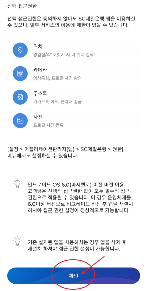 2. 앱을 실행해주세요. 첫 화면에서는 앱 접근권한 안내가 나옵니다. 읽어보시고 확인을 눌러주세요.