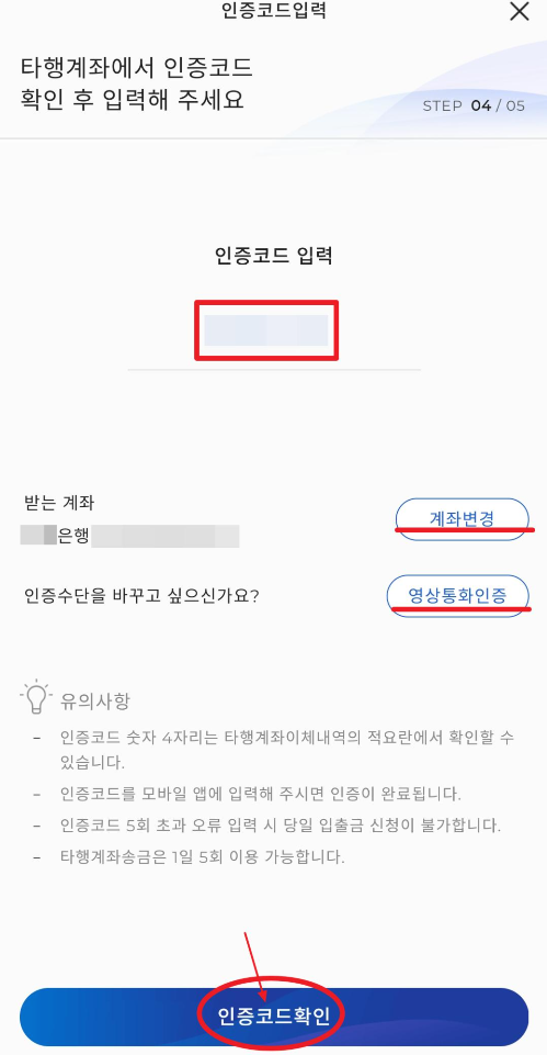 그 메시지에서 제일 뒤에 4자리 숫자를 기억하고 다음 화면에서 나오는 인증코드입력에 그 4자리 숫자를 입력하고 인증코드확인을 누르면 인증이 완료되게 됩니다. 만약 다른 계좌에 문제가 있다면 계좌를 변경하거나, 인증수단을 상담원과의 영상통화인증으로 바꿀수 있으니 너무 걱정하지 마시기 마랍니다.
