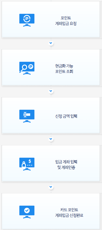 홈페이지 or 앱 접속 ▶ 개인정보 동의 및 본인인증(카드, 아이핀, 휴대폰 인증) ▶ 조회 위임 동의 ▶ 계좌입금클릭 ▶ 포인트 계좌입금 요청 ▶ 현금화 가능 포인트조회 ▶ 카드사 별 신청금액 입력 ▶ 입금계좌 입력 및 계좌인증 ▶ 카드포인트 계좌입금 신청 완료