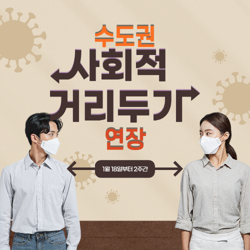 ★이에 따라 1월 18일부터 2주간 수도권은 사회적 거리두기 2.5단계, 비수도권은 사회적 거리두기 2단계로 오는 31일까지 유지됩니다.