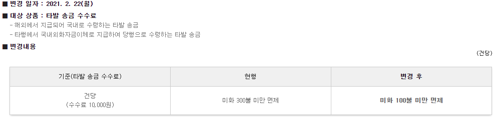 신한은행 : 건당 1만원 / $100 미만 면제 / 모바일 전자거래 시(쏠 앱 이용) 50% 감면