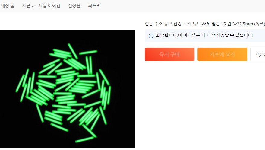 웹서핑을 해보니 밤낚시용 케미라이트가 삼중수소로 만들어져 해외 온라인 샾에서 보이긴 하는데 다행히 판매중지된 상태입니다. 은연중에 아직도 방사선 물질이 함유된 제품들이 판매되고 있으니 꼼꼼히 확인해 보아야겠습니다.