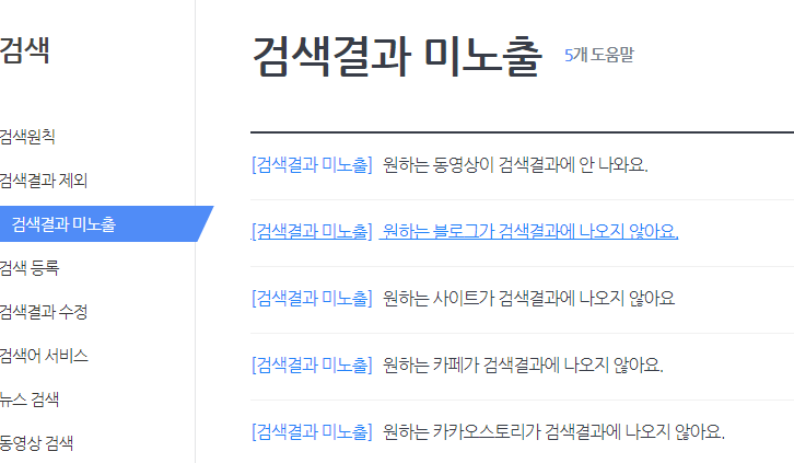 다음은 검색에서 검색결과 미노출 카테고리를 선택하시고, 그 검색결과 미노출 사례중에 원하는 '블로그가 검색결과에 나오지 않아요.' 메뉴를 클릭하여 내용을 한번 체크해보시고 해당사항이 없다면,