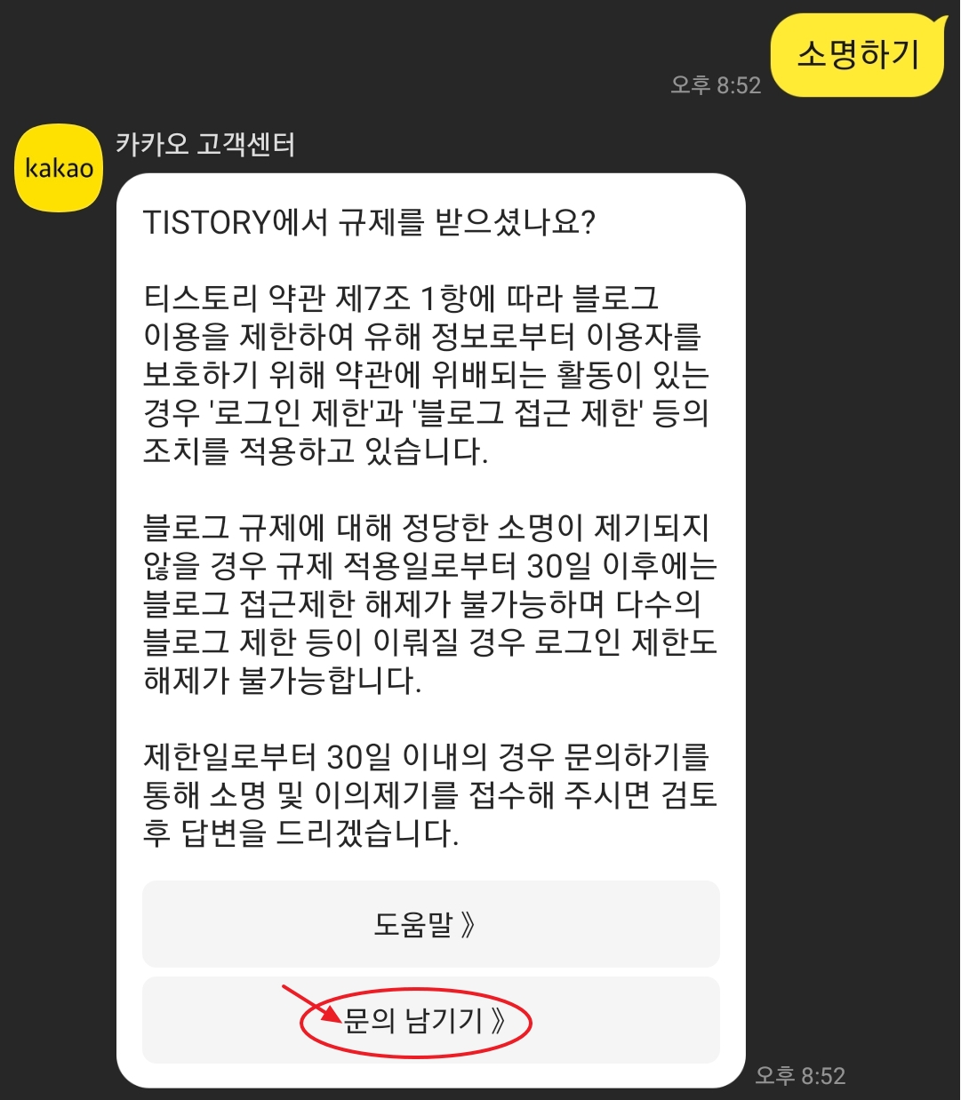 마지막 메시지에는 소명하기를 누르면 문의 남기기 메뉴가 보이는 데요.