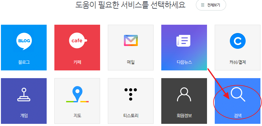 그것을 누르면 도움이 필요한 서비스를 선택하라는 페이지가 나오는데, 그중에서 검색을 클릭합니다.