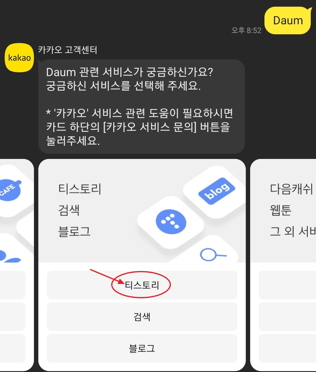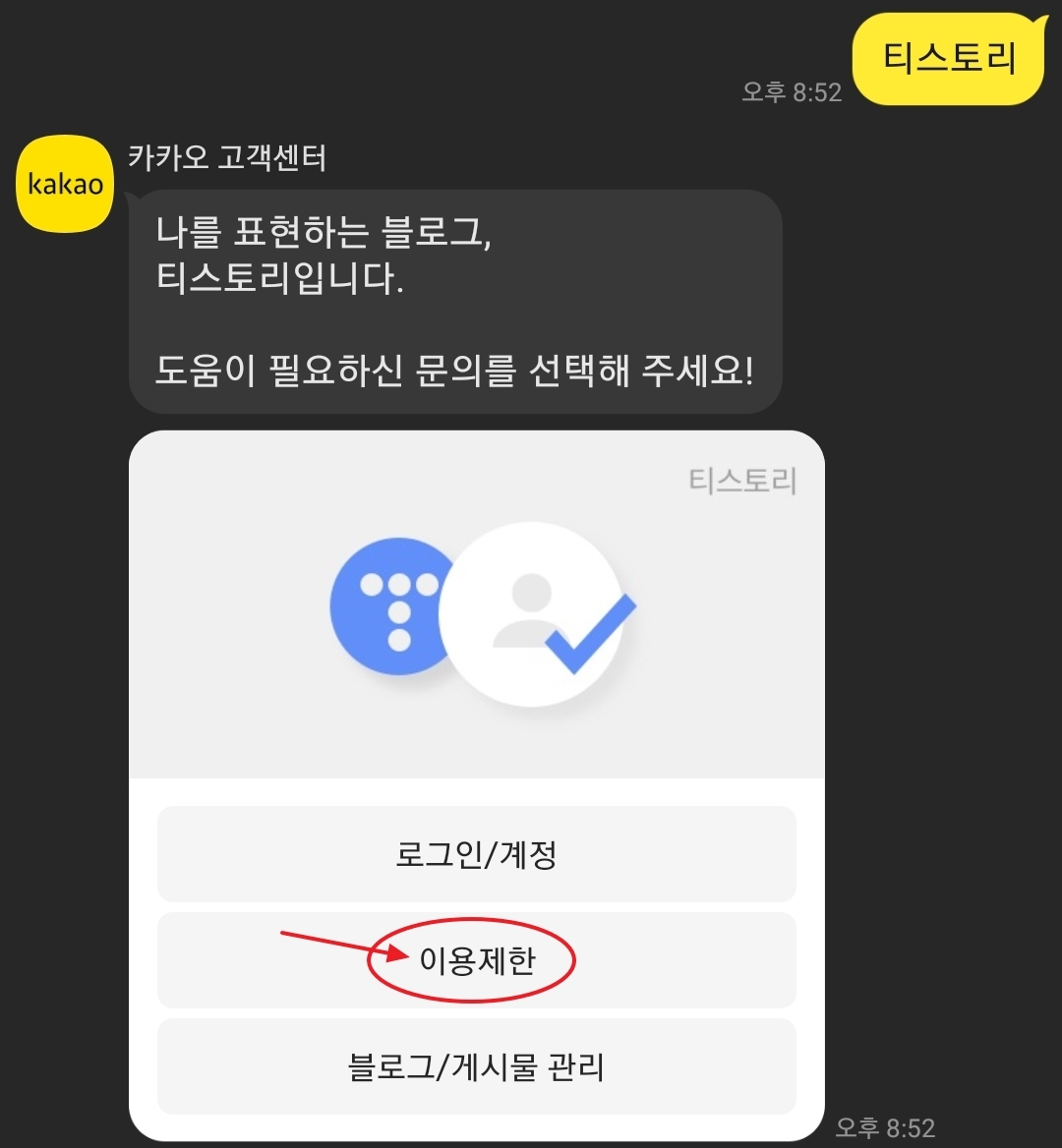 메시지 화면이 뜨면 해당 화면에서 먼저 문의할 서비스 중에 Daum을 클릭해줍니다. 그리고 티스토리를 클릭하고 다음 메시지에서는 이용제한 메뉴를 눌러주세요.